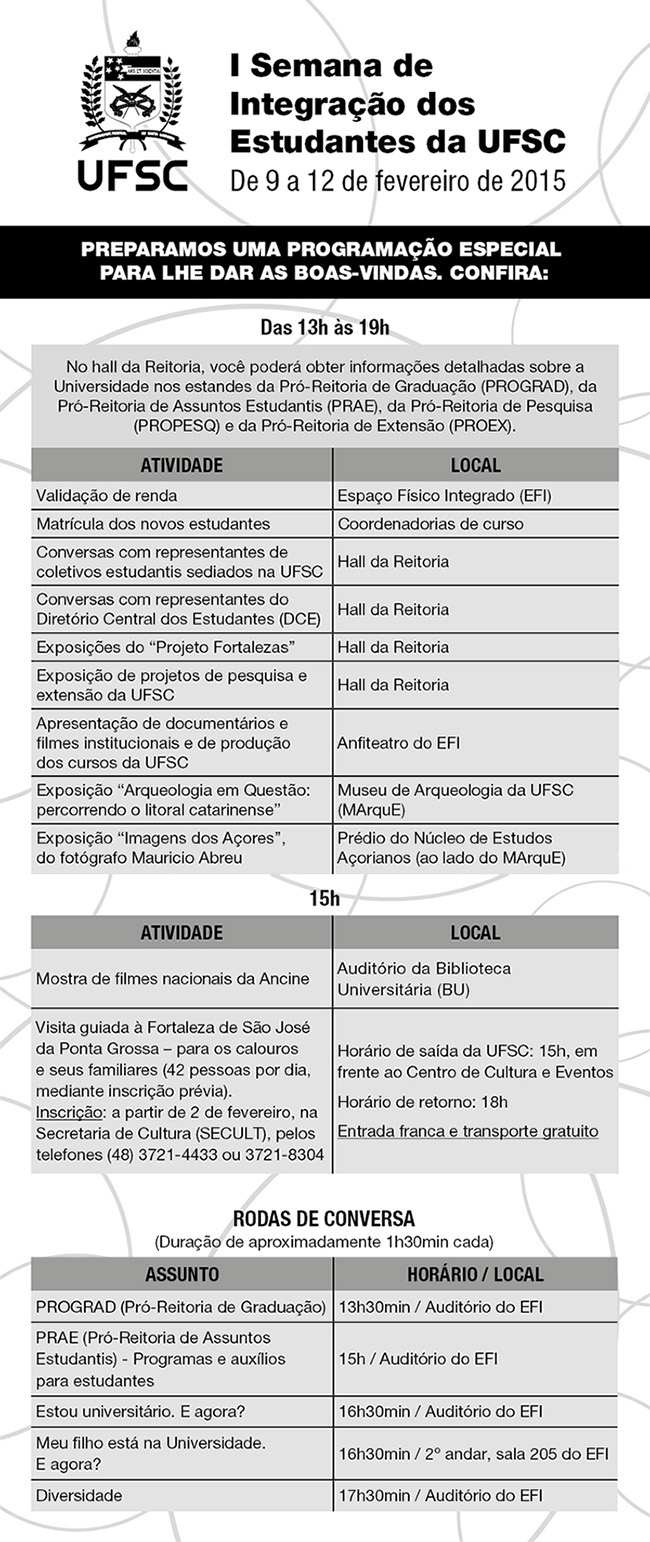 A Biblioteca Universitária está com uma programação de exibição de filmes nacionais de 09 a 12 de fevereiro, período de realização das matrículas dos novos alunos da UFSC. A atividade faz parte da programação especial da 1ª Semana de Integração dos Estudantes da UFSC, organizada pela Pró-Reitoria de Graduação (Prograd) que, além da exibição de filmes, conta com passeios, exposições, rodas de conversas, entre outras atividades.